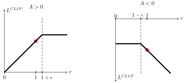 我们用 \(r_t(\theta)\) 表示概率分布的比率 \(r_t(\theta)=\frac{\pi_\theta(a_t|s_t)}{\pi_{\theta_{old}}(a_t|s_t)}\) ,可以看出 \(r_t(\theta_{old}) = 1\) ,TRPO 想要最大化的就是这个替代目标函数: \[ L^{CPI}(\theta)=\hat{\mathbb{E}}_t\left[ \frac{\pi_\theta(a_t|s_t)}{\pi_{\theta_{old}}(a_t|s_t)} \hat{A}_t \right] = \hat{\mathbb{E}}_t\left[ r_t(\theta)\hat{A}_t \right] \] 上标 \(CPI\) 代表 conservative policy iteration 。如果没有 TRPO 里的约束,这个目标函数会非常快地增长。因此我们考虑对这个目标函数做一下修改,使得当 \(r_t(\theta)\) 偏离 1 时增加一些惩罚: \[ L^{CLIP}(\theta) = \hat{\mathbb{E}}_t\left[ \min( r_t(\theta)\hat{A}_t, \text{clip}( r_t(\theta),1-\epsilon,1+\epsilon )\hat{A}_t ) \right] \] 其中 \(\epsilon\) 是一个超参数,假设 \(\epsilon=0.2\) 。这个目标函数的外层是一个 min 函数,第一项为 \(L^{CPI}\) ,第二项 \(\text{clip}( r_t(\theta),1-\epsilon,1+\epsilon )\hat{A}_t\) 将 \(L^{CPI}\) 目标函数修改了一下,它把概率分布比率进行裁剪,使得这个比率的变动限制在 \([1-\epsilon,1+\epsilon]\) 的范围之内,最后通过外层的 min 函数取裁剪过与未裁剪过的目标函数的最小值,所以最终结果 \(L^{CLIP}(\theta)\) 便是 \(L^{CPI}\) 的下界。我们可以发现在 \(\theta_{old}\) 的附近(也就是 \(r=1\) 的附近),\(L^{CLIP}(\theta)\) 与 \(L^{CPI}(\theta)\) 一阶相等。\(L^{CLIP}(\theta)\) 与概率比率的关系可以用下图表示: