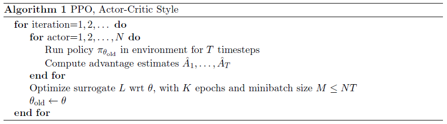 每一次迭代,\(N\) 个 actor 并行地采样 \(T\) 步数据,然后再用这 \(NT\) 步数据构建替代的损失函数,并使用 mini-batch 的随机梯度下降算法进行优化 \(K\) 次。