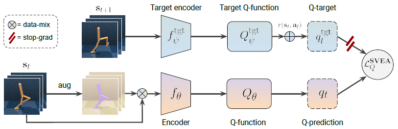 计算 target \(Q\) 时,不用增强后的图像 state。而在计算 online \(Q\) 时,共同使用原始图像和增强后的图像。 \[ \begin{aligned} \mathcal{L}_{Q}^{\mathrm{SVEA}}(\theta, \psi) & \triangleq {\color{blue}\alpha \mathcal{L}_{Q}\left(\mathrm{~s}_{t}, q_{t}^{\mathrm{tgt}} ; \theta, \psi\right)}+ {\color{red}\beta \mathcal{L}_{Q}\left(\mathrm{~s}_{t}^{\mathrm{aug}}, q_{t}^{\mathrm{tgt}} ; \theta, \psi\right) }\\ &=\mathbb{E}_{\mathbf{s}_{t}, \mathbf{a}_{t}, \mathbf{s}_{t+1} \sim \mathcal{B}}\left[\alpha\left\|Q_{\theta}\left(f_{\theta}\left(\mathbf{s}_{t}\right), \mathbf{a}_{t}\right)-q_{t}^{\mathrm{tgt}}\right\|_{2}^{2}+\beta\left\|Q_{\theta}\left(f_{\theta}\left(\mathrm{s}_{t}^{\text {aug }}\right), \mathbf{a}_{t}\right)-q_{t}^{\mathrm{tg}}\right\|_{2}^{2}\right] \end{aligned} \] 其中 \(q_t^{\mathrm{tgt}}\) 直接使用为增强后的图像 state 来进行计算,蓝色部分表示更新为增强的,红色则是增强后的,\(\alpha\)\(\beta\) 为调节两者的系数。