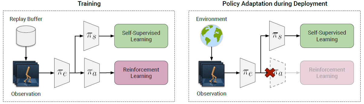 由于强化学习训练的环境与现实部署的环境有差别,为了消除不同环境的差异,增加策略的泛化性,可以在部署推断的阶段继续训练。但是在现实环境中由于可能没有奖励信号,再使用强化学习训练就会变得不可行。所以论文中使用了额外的一个自监督方式来继续训练。