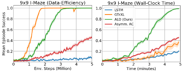 很明显能看出,LSTM 的样本利用率很低,要跟环境交互非常多次才能收敛,但 LSTM 的训练非常快,尽管需要的样本多,但每个样本的训练时间很短。而 transformer 正好相反,样本利用率高,但每个样本的训练时间很长。