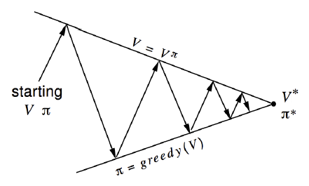 图中可以看出给定一个策略,箭头往上表示策略评估,评估完毕箭头往下表示策略改进,直至收敛。