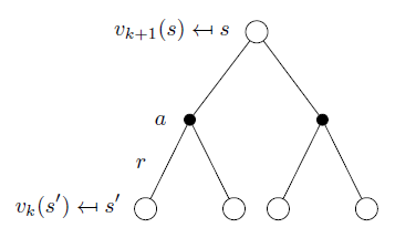 \[ v_{k+1}= \sum_{a\in \mathcal{A}} \pi(a|s)\left( \mathcal{R}^a_s +\gamma\sum_{s'\in\mathcal{S}} \mathcal{P}^a_{ss'}v_k(s') \right) \] 或用矩阵形式表示: \[ \boldsymbol{v^{k+1}} = \boldsymbol{\mathcal{R}^\pi}+\gamma \boldsymbol{\mathcal{P}^\pi v^k} \]