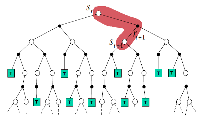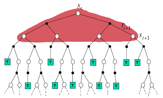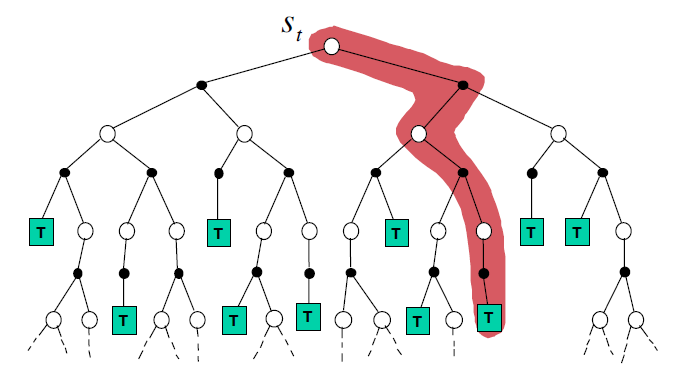 Monte-Carlo Backup :需要采样,不自举,需要一个完整的回合(图中从根节点到叶结点 T 的一条路径就是一个回合) \[