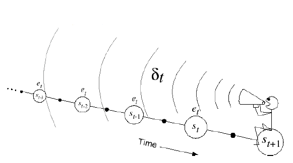 资格迹结合了这两种观点: \[ \begin{align*} E_0(s) &= 0 \\ E_t(s) &= \gamma \lambda E_{t-1}(s)+ 1\{S_t=s\} \end{align*} \] 后向视角的 TD(λ) 算法为: \[ \delta_t = R_{t+1} + \gamma V(S_{t+1}) - V(S_t) \\ V(s) \leftarrow V(s) + \alpha \delta_t E_t(s) \] 当 \(\lambda=0\) 时,只有当前状态被更新: \[ E_t(s) = 1\{ S_t=s \} \\ V(s) \leftarrow V(s) + \alpha \delta_t E_t(s) \] 与 TD(0) 算法等价: \[ V(s_t) \leftarrow V(s_t) + \alpha \delta_t \] 当 \(\lambda = 1\) 时,反向视角也就是使用在线更新,粗略的看起来,与 every-visit MC 算法相同,状态价值会一步步累积起来,若在回合结束之后再去计算价值函数,也就是离线更新,则与 MC 算法完全相同。