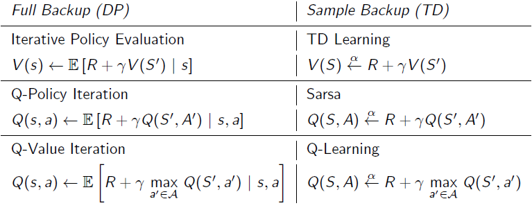 用异策略来学习行为价值函数 \(Q(s,a)\) ,不需要进行重要性采样,下一个行为的选择遵循行为策略 (behavior policy) \(A_{t+1} \sim \mu (\cdot|S_t)\),而另一种继任的行为的选择遵循目标策略 (target policy) \(A' \sim \pi (\cdot|S_t)\),以此得到更新过程: \[ Q(S_t,A_t) \leftarrow Q(S_t,A_t) + \alpha (R_{t+1} + \gamma Q(S_{t+1}, A') - Q(S_t, A_t)) \] 其中 target policy 对于 \(Q(s,a)\) 采用贪婪策略 \[ \pi(S_{t+1}) = \argmax_{a'} Q(S_{t+1},a') \] behavior pllicy对于 \(Q(s,a)\) 采用 ϵ-greddy 策略,所以 Q-Learning 的目标函数简化为: \[ \begin{align*} &R_{t+1} + \gamma Q(S_{t+1}, A') \\ =& R_{t+1} + \gamma Q(S_{t+1}, \argmax_{a'}Q(S_{t+1},a')) \\ =& R_{t+1} + \max_{a'}\gamma Q(S_{t+1},a') \end{align*} \]