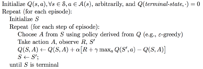 所以 Q-Learning 控制算法为: \[ Q(S,A) \leftarrow Q(S,A) + \alpha \left( R + \gamma \max_{a'}Q(S', a') - Q(S,A) \right) \] 伪代码: