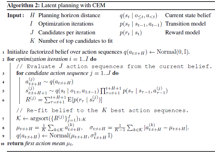 在论文 Learning Latent Dynamics for Planning from Pixels 中,作者在基于模型的 planning 阶段也使用了一种基于种群的进化学习方法 cross entropy method (CEM) 。CEM 算法非常简单,初始化一个与时间有关的高斯分布表示最优动作序列 \(a_{t: t+H} \sim \operatorname{Normal}\left(\mu_{t: t+H}, \sigma_{t: t+H}^{2} \mathbb{I}\right)\) ,其中 \(t\) 表示当前 time step,\(H\) 是 planning 的长度。从零均值、单位方差开始,重复地采样 \(J\) 个动作序列,将他们放入到环境模型中进行评估,然后使用最佳的 \(K\) 个动作序列来更新高斯分布。在 \(I\) 次迭代过后,返回当前步的高斯的均值 \(\mu_t\) 作为动作才真正地交给环境与环境交互。收到下个观测值后,动作的高斯分布重新置为零均值、单位方差,以避免陷入局部最优。整体算法如下: