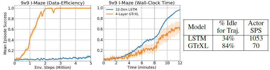 很明显能看出,LSTM 的样本利用率很低,要跟环境交互非常多次才能收敛,但 LSTM 的训练非常快,尽管需要的样本多,但每个样本的训练时间很短。而 transformer 正好相反,样本利用率高,但每个样本的训练时间很长。