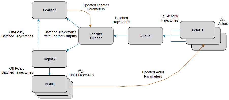 所有的 Actor 并行地与环境交互收集数据,采集到完整的回合后,放入队列中。Learner Runner 从队列中取出适合训练的一批回合,存到 replay buffer 中,并同时交给 Learner 使用标准的强化学习进行训练。为了把 Learner 中的策略蒸馏到 Actor 中,Distill 模块利用经验池中数据,缩小 Learner 与 Actor 之间的差距。