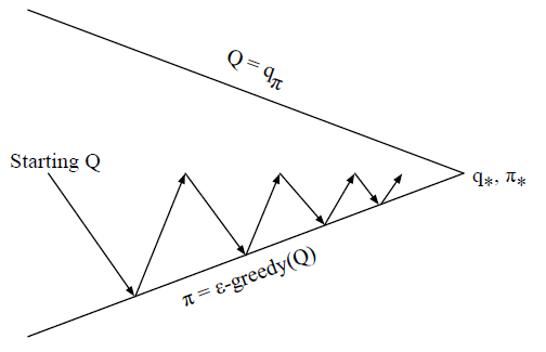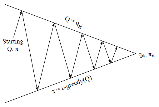箭头向上为策略评估,向下为策略改善,使用的是 ϵ-greedy 方法。然而在策略评估阶段,理论上需要经历无限次回合才能收敛到 \(Q=q_\pi\) ,但实际上不需要经历那么久,我们可以每经历一个回合,就进行一次评估,近似到 \(Q \approx q_\pi\) ,同样整个 MC 算法仍会收敛: