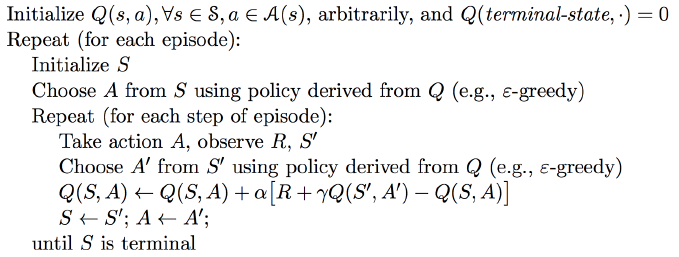 用 Sarsa 来更新行为价值函数: \[ Q(S,A) \leftarrow Q(S,A) + \alpha (R+\gamma Q(S',A') - Q(S,A)) \] 很形象的可以表示为:在当前行为价值函数 \(Q(S,A)\) 下向前走一步获得即使 \(R\) 与下一步的行为价值函数 \(Q(S',A')\) ,连起来正好是 “SARSA” ,这也是 Sarsa 算法名字的来历。