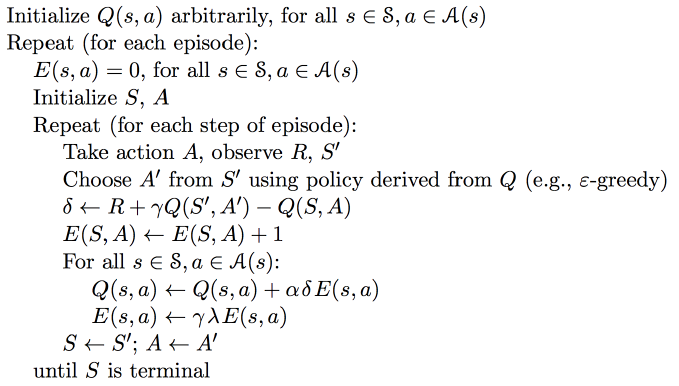 与 TD(λ) 的反向视角相同,我们使用资格迹 (eligibility traces) 来进行在线更新 (online) ,但在 Sarsa(λ) 中,每一个状态-行为对就有一个资格迹,数量较多。 \[ \begin{align*} E_0(s,a) &=0\\ E_t(s,a) &= \gamma \lambda E_{t-1}(s,a) + 1\{S_t=s,A_t=a\} \end{align*} \] \[ \delta_t = R_{t+1} + \gamma Q(S_{t+1},A_{t+1}) - Q(S_t,A_t)\\ Q(s,a) \leftarrow Q(s,a) + \alpha \delta_t E_t(s,a) \]