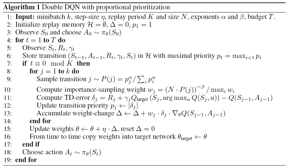 该算法将 Double DQN 与 本文的 Prioritized Experience Replay 结合起来,最主要的修改在于选取经验片段和用重要性采样来更新参数两个点。
