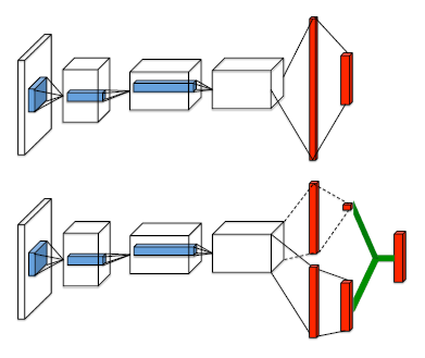 如图所示,上图为传统的神经网络架构,包括前面蓝色的卷积层 ,与最后红色的全连接层,输出某个状态下对应所有行为的行为价值函数。而下图则是改进过的 dueling network ,前面蓝色卷积层相同,但接着使用了两个分离的全连接层,来分别估计状态价值与优势函数,最后通过绿色线,将两者估计组合起来,输出行为价值函数,也就是说尽管 dueling network 在架构上做了改变,但输出的内容与传统的神经网络架构是相同的。