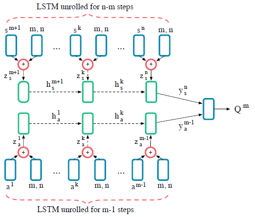 为了要选择行为 \(a^m\) ,整个网络的输入为 \(o^m=(a^1,\cdots,a^{m-1},s^{m+1},\cdots,s^n)\) 还有 \(m\) 与 \(n\) 。它们需要经过两个单层的多层感知机 (MLP) 。\(z_a^k=\text{MLP}[1\times 64](a^k) \oplus \text{MLP}[2\times64](m,n)\) ,\(a^k\) 与 \((m,n)\) 分别经过单层 MLP 维度展开到 64 再进行相加得到 \(z_a^k\) 。\(z_a^k\) 接着经过 LSTM 循环神经网络得到 \(y_a^k\) ,中间的隐藏状态为 \(h_a^k=\text{LSTM}_a[64](z_a^k,h_a^{k-1})\) 。同理,除了观察到的行为之外,还有观察到的剩余 \(n-m\) 个帽子的颜色状态 ,最终定义为 \(y_s^k\) ,\(h_s^k=\text{LSTM}_s[64](z_a^k,h_a^{k-1})\) ,最后两个 LSTM 网络的结果值 \(y_a^{m-1}\) ,\(y_s^n\) 用来估计行为的 \(Q\) 值: \(Q^m=\text{MLP}[128\times64,64\times64,64\times1](y_a^{m-1}||y_s^n)\) 。