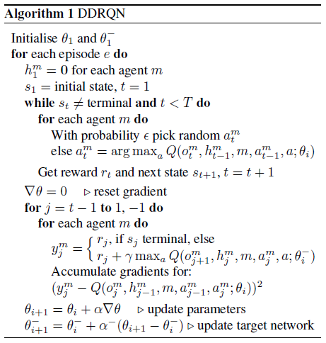 根据以上的改进,DDRQN 的 \(Q\) 函数形式为 \(Q(o_t^m,h_{t-1}^m,m,a_{t-1}^m,a_t^m;\theta_i)\) ,\(m\) 为智能体的序号,\(o_t^m\) 为部分观察到的状态,\(h_{t-1}^m\) 为 RNN 输出的隐藏状态,\(a_{t-1}^m\) 为之前采取的行为,注意到这里的 \(\theta_i\) 与 \(m\) 无关,以此来实现参数共享。具体算法为: