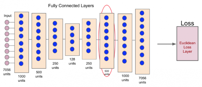 输入为原始状态,隐藏层的最后一层大小与原始状态大小相同,输出为一个欧氏距离误差层,尽可能减少最后的状态特征与原始输入的差异。红色圈圈出来的即为降低了维度的 \(\sigma(s)\) 。