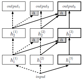 在实践中,我们会修改一下上述公式,增加一个 adapter 也就是图中的灰色 a 方块,它能既增强初始化条件又能降维: \[ h_i^{(k)}=f\left( W_i^{(k)}h_{i-1}^{(k)} + U_i^{(k:j)}\sigma(V_i^{(k:j)}\alpha_{i-1}^{(<k)}h_{i-1}^{(<k)}) \right) \] 其中 \(h_{i-1}^{(<k)}=[h_{i-1}^{(1)}\cdots h_{i-1}^{(j)} \cdots h_{i-1}^{(k-1)}]\) 。再将之前的横向网络传入当前多层感知机之前,先乘以一个学习标量,用来调整之前横向层的影响程度。\(V_i^{(k:j)}\) 是一个射影矩阵,用来进行降维,使得随着 \(k\) 越来越多,但横向连接的参数数量与 \(|\Theta^{(1)}|\) 相同,在卷积神经网络中,它可以为 \(1 \times 1\) 卷积层。