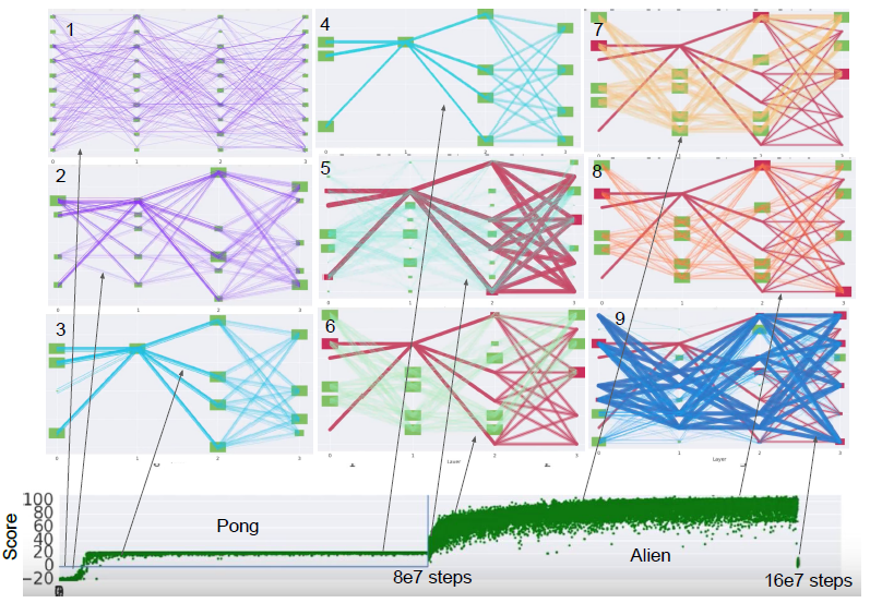 一共训练了两个任务,第一个任务为 Pong 第二个为 Alien 。每个任务都连续地训练 80M 时间长度。Box 1 的紫色路径展现了训练开始时的随机初始化,接着使用强化学习算法训练几个回合游戏,同时用锦标赛选择算法来进化网络路径,因此进化与学习同时进行。Box 2 展示了有一点收敛之后的情况,会发现一些路径已经有些重叠。最终收敛的状态如 Box 3 所示,只会经过一条路径,Box 4 展示出接下来的训练中,单条路径会一直保持到训练结束。这时切换到第二个任务,同时 Pong 的路径会被冻结,也就是说 Pong 路径上的神经网络模块参数不会改变。Box 5 用深红色路径表示被冻结的路径,用淡蓝色表示随机初始化的路径。新路径在 Box 8 中进化到收敛的状态,160M 步训练之后,Alien 游戏的最优路径被固定,如 Box 9 所示。