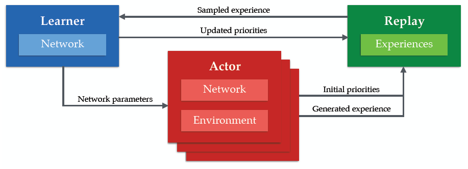 Horgan, Dan, John Quan, David Budden, Gabriel Barth-Maron, Matteo Hessel, Hado van Hasselt, and David Silver. “Distributed Prioritized Experience Replay.” ArXiv:1803.00933 [Cs], March 2, 2018. http://arxiv.org/abs/1803.00933.
