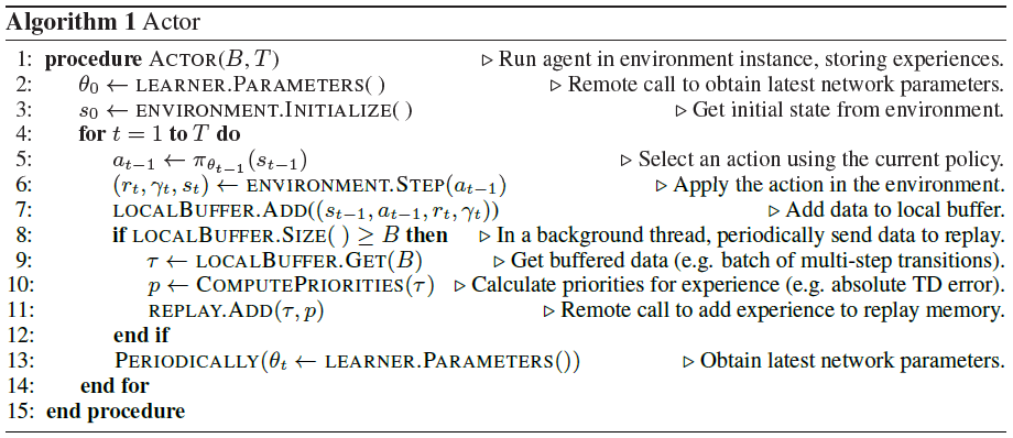 在 Massively Parallel Methods for Deep Reinforcement Learning 论文中,DeepMind 将强化学习分为了两个部分,可以同时运行并且不需要非常复杂的同步机制。第一部分为与环境交互,评价基于深度神经网络的策略,并将观测到的数据储存在经验池中。我们把这第一部分称为 acting 。第二部分为从经验池中采样数据并更新策略参数,我们把这一部分称为 learning 。