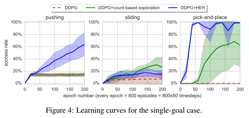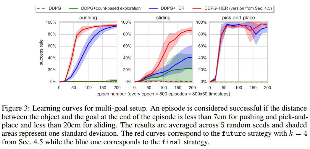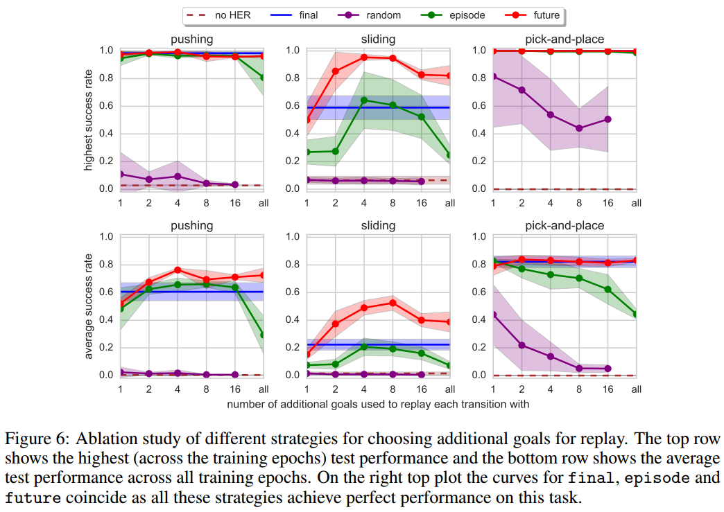- 蓝色曲线为使用了 HER 的 DDPG,文中并未说明 HER 是哪种模式,猜测是 final 模式,因为文中实验部分之前都是以 final 模式进行举例