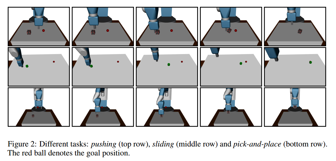 - 从左至右依次是Pushing,Sliding,Pick-and-place任务