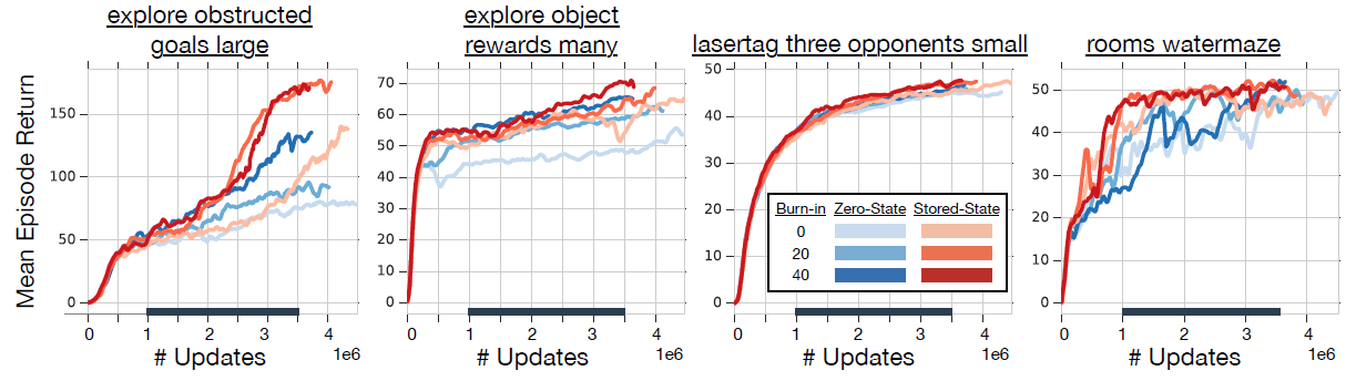 从这些实验结果也可以得出结论:stored state 和 burn-in 方法相对于全零初始状态而言具有更好的性能。