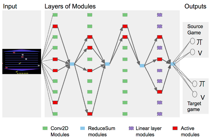 该 PathNet 网络架构用了 4 层,每层包含 \(M=10\) 个模块,前三层绿色的都为卷积神经网络,最后一层紫色的为全连接网络,具体配置可以参考论文。在 PathNet 的每一层之间,被激活的红色模块输出会进行累加,再输入到下一层中,图中显示为蓝色的方块。输出层由于不会共享网络参数,所以单独列在最右边,每个 Atari 游戏都独有一个输出层。