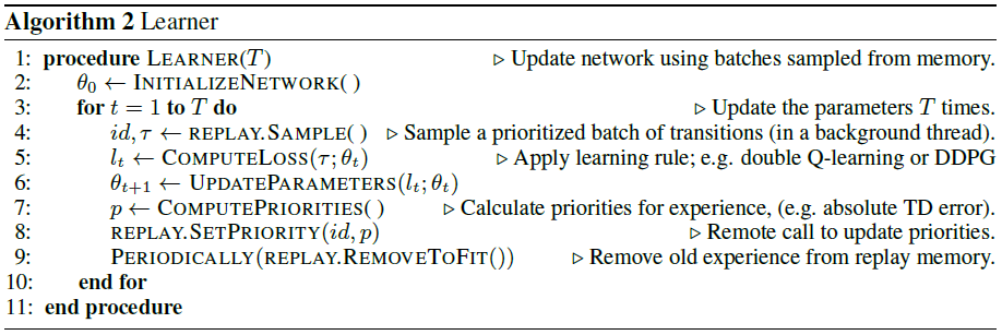与 Massively Parallel Methods for Deep Reinforcement Learning 不同的是,我们用一个共享的、中心化的经验池,同时并不是等概率地从经验池中采样,而是有优先级的。除此之外,我们可以给不同的 actor 不同的探索策略,来丰富经验。