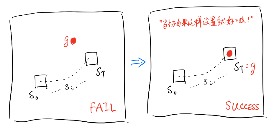 HER的主要思想就是:为什么一定要考虑我们设定的目标呢?假设我们想让一个智能体学会移动到某个位置,它在一个episode中没有学到移动到目标位置就算失败吗?假定序列为 \(s_{0},s_{1},s_{2}, \cdots ,s_{T}\) ,目标为\(g\),我们何不换一种思路考虑:如果我们在episode开始前就将目标状态 \(g\) 设置为 \(s_{T}\) ,即 \(g=s_{T}\) ,那么这样看来智能体不就算是完成目标了吗?