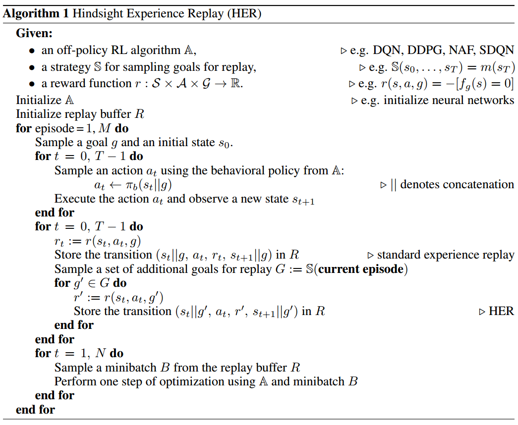 Hindsight意为事后,结合强化学习中序贯决策问题的特性,我们很容易就可以猜想到,“事后”要不然指的是在状态s下执行动作a之后,要不然指的就是当一个episode结束之后。其实,文中对常规经验池的改进也正是运用了这样的含义。
