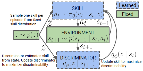 Eysenbach, B., Gupta, A., Ibarz, J., & Levine, S. (2018). Diversity is all you need: Learning skills without a reward function. arXiv preprint arXiv:1802.06070.
