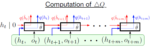 - (下图红线)使用经验池序列来产生的 Q 值,即经验池中储存 RNN 的初始状态 \(h_t\) 或者用全零状态代替和观测值 \(o_t, \cdots, o_{t+m}\) ,Q 值通过上述提到的 stored state 和 burn-in 方法生成,用 \(\hat{h}_{t}\) 表示,初始状态为 \(\hat{h}_{t}=0\) 或 \(\hat{h}_{t}=h_{t}\)。