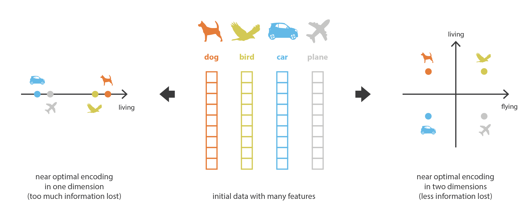但是,在我们应该注意两点。 首先,没有重建损失的降维通常要付出代价:隐空间中缺乏可解释和可利用的结构(缺乏正则化),其次,在大多数情况下,降维的最终目的不仅仅是减少数据的维数,而且要在减少维数的同时将数据结构信息的主要部分保留在简化的表征中。 由于这两个原因,必须根据降维的最终目的来仔细控制和调整隐空间的尺寸和 autoencoder 的“深度”(压缩的程度和质量)。