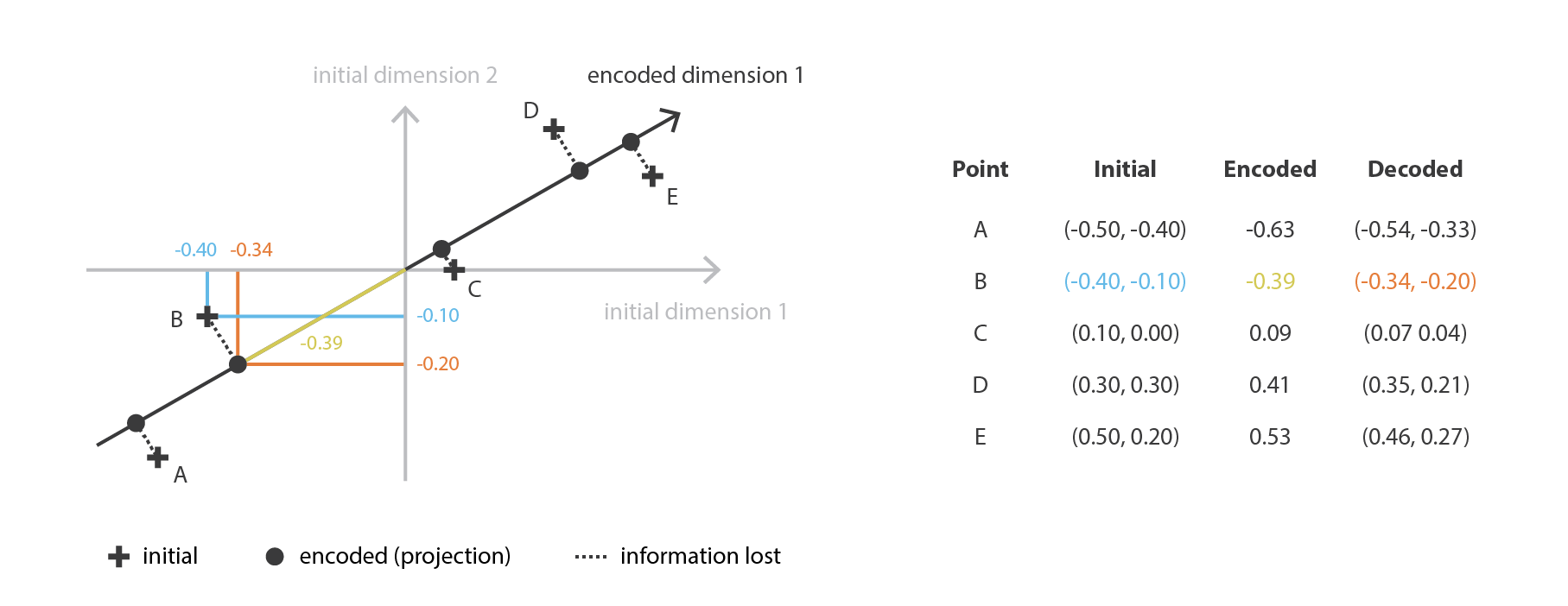 如果用我们的框架来解释的话,就是我们要在一堆行是标准正交化的 \(n_d \times n_e\) 矩阵 \(E\) 中要到一个 encoder,同时要在一堆 \(n_e \times n_d\) 矩阵 \(D\) 中找到对应的 decoder。可以证明,与协方差特征矩阵的 \(n_e\) 个最大特征值相对应的特征向量是正交的,并定义维度为 \(n_e\) 的最佳子空间有着最小的投影数据近似误差。 因此,可以将这些 \(n_e\) 个特征向量选择为我们的新特征,因此,降维问题可以表示为特征值、特征向量问题。 此外,在这种情况下,decoder 矩阵就是 encoder 矩阵的转置。