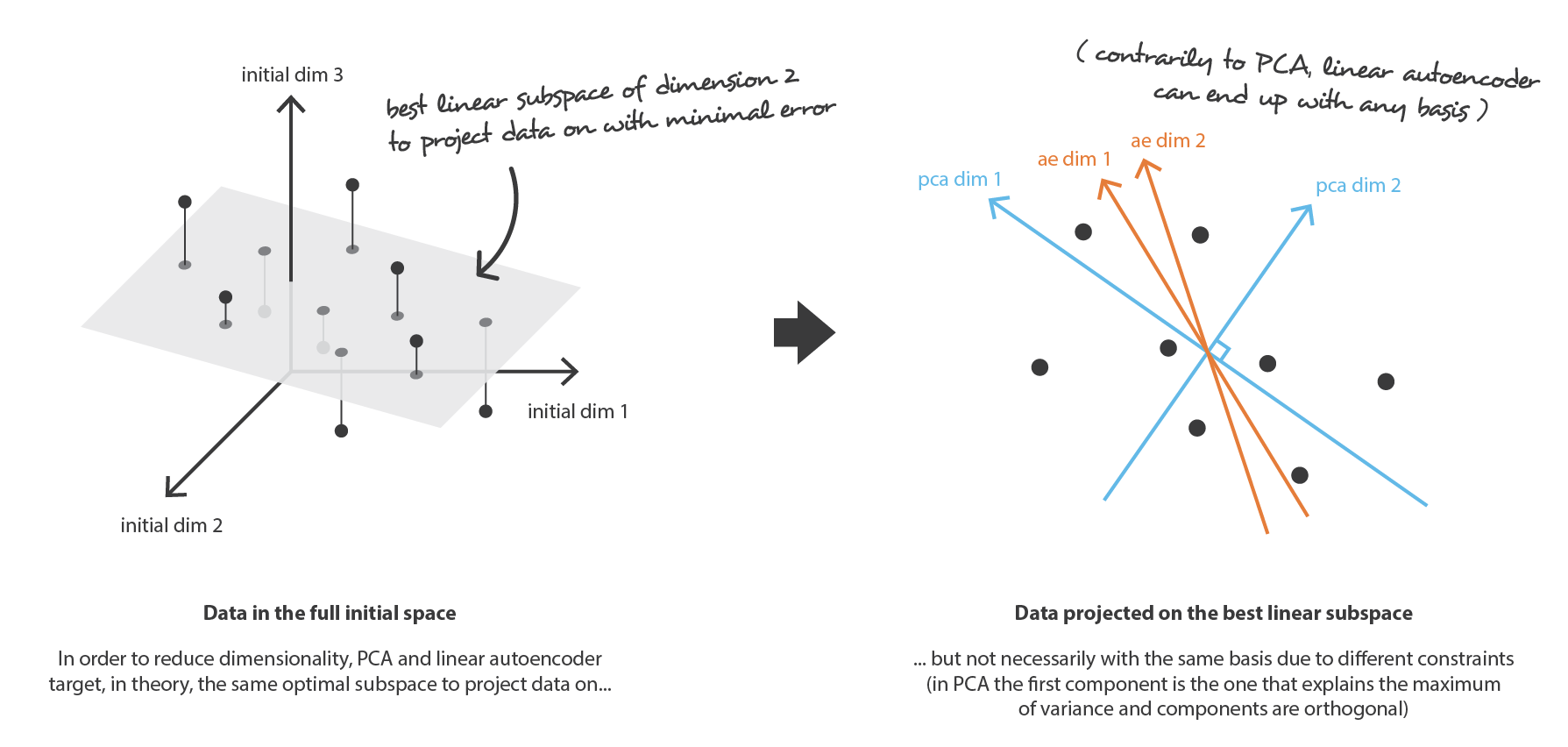 首先,假设我们的 encoder, decoder 的网络架构都只有一层,也没有用到非线性的激活器(线性 autoencoder)。 这样的 encoder 和 decoder 就是简单的线性变换,可以表示为矩阵。 在这种情况下,在某种意义上,我们可以看到与 PCA 的关系,就像 PCA 一样,我们就是要去找最佳的线性子空间来投影数据,而这样做时要尽可能减少信息丢失。 用 PCA 获得的 encoder,decoder 矩阵自然定义了用梯度下降算法所能满足的一种解决方案,但这不是唯一的解决方案。 事实上,某些基向量可以来描述相同的最佳子空间,因此,几个 encoder对也可以给出最佳的重构误差。 此外,对于线性 autoencoder(与PCA相反),我们最终获得的新特征不一定是独立的(神经网络中没有正交性约束)。