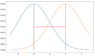从下图可以看出在参数空间中仅使用欧几里得距离会出现问题。考虑两个高斯分布,变量只为均值,方差固定为 2 和 0.5。
